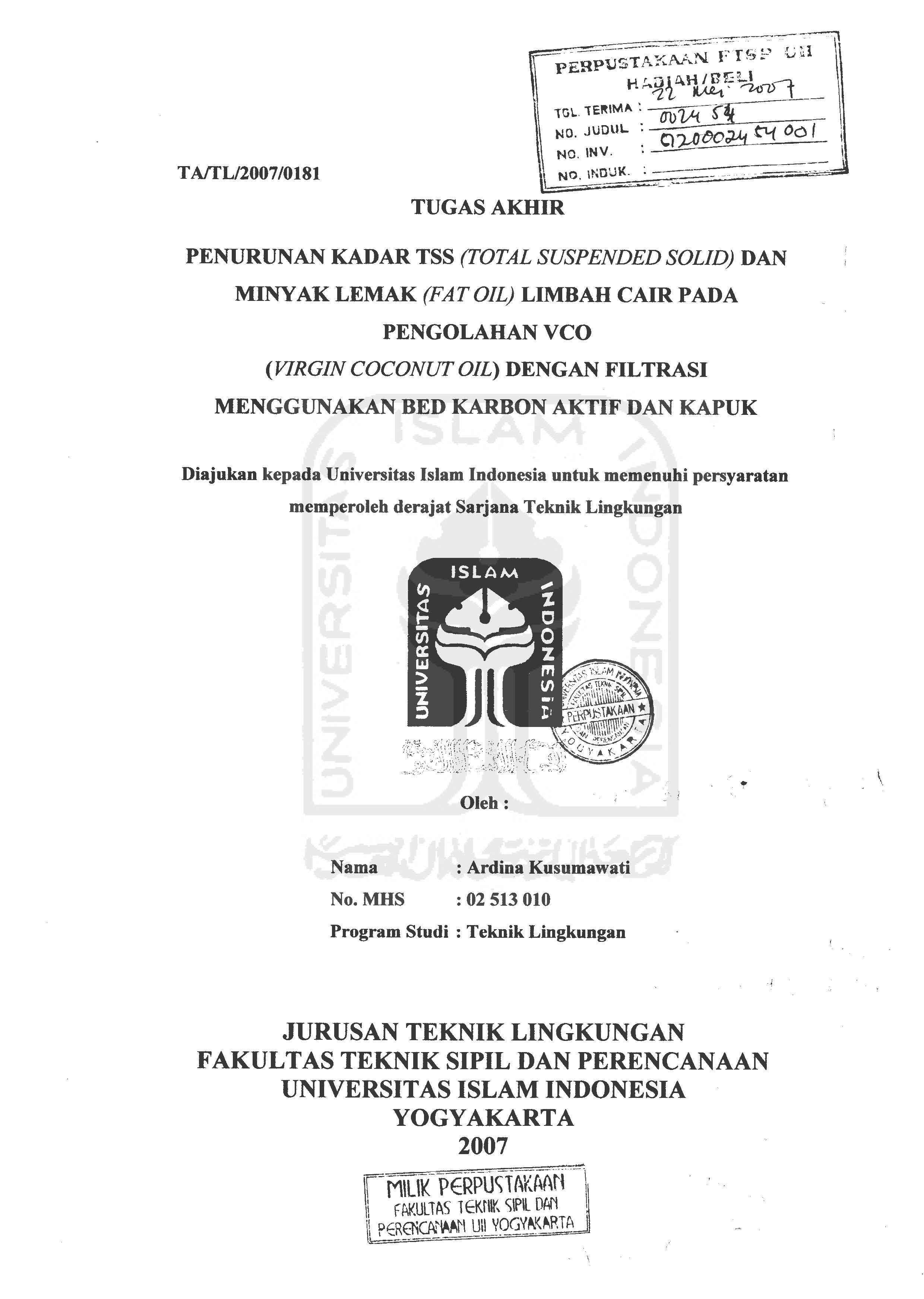 Penurunan Kadar TSS (Total Suspended Solid) dan Minyak Lemak (Fatoil) Limbah Cair pada Pengolahan VCO (Virgin Coconut Oil) dengan Filtrasi Menggunakan Bed Karbon Aktif dan Kapuk