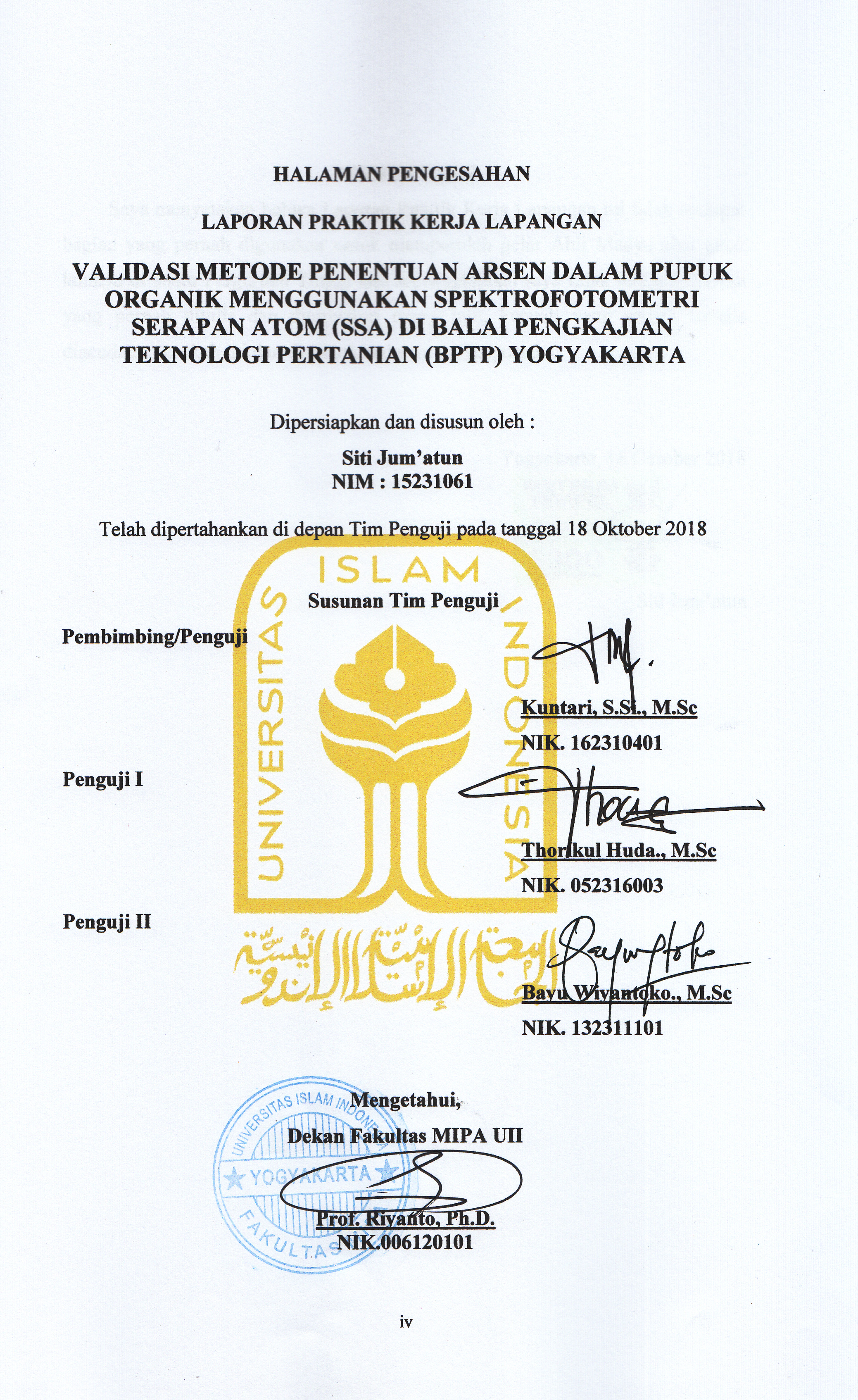 VALIDASI METODE PENENTUAN ARSEN DALAM PUPUK ORGANIK MENGGUNAKAN SPEKTROFOTOMETRI SERAPAN ATOM (SSA) DI BALAI PENGKAJIAN TEKNOLOGI PERTANIAN (BPTP) YOGYAKARTA